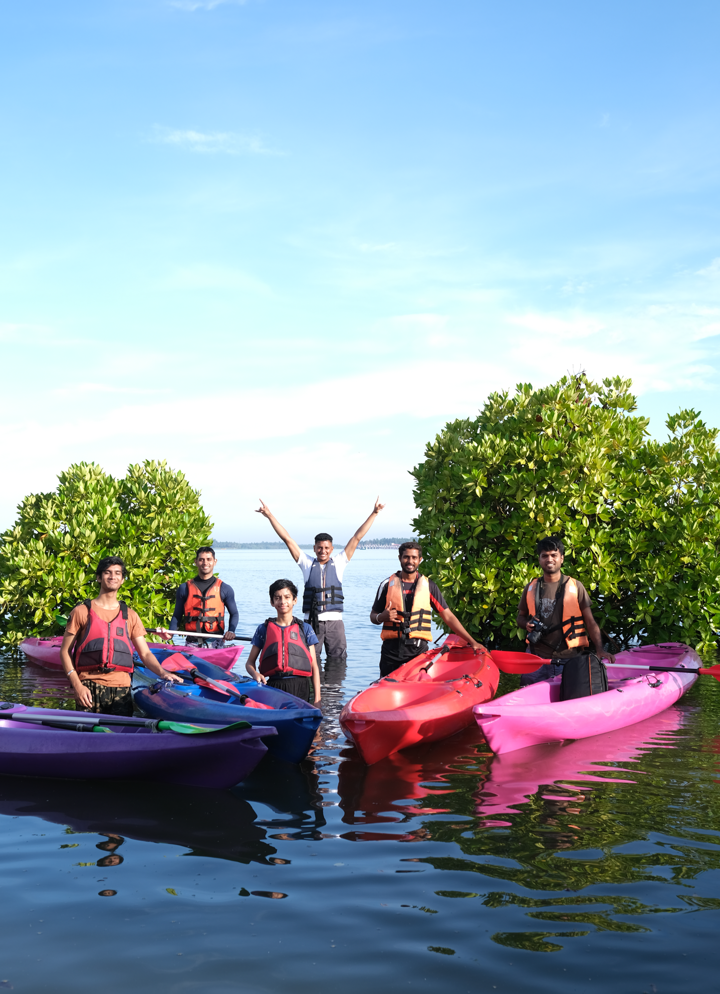 In these 2 hours, paddle through the serene backwaters of the Swarna River and immerse yourself in the enchanting beauty of the coconut trees along the way. As you paddle and reach the Mangrove Forest, the lush green ecosystem creates a peaceful atmosphere. Here we will take a moment to step off our Kayaks and explore the sandy shores, capturing stunning photographs and creating treasured memories.